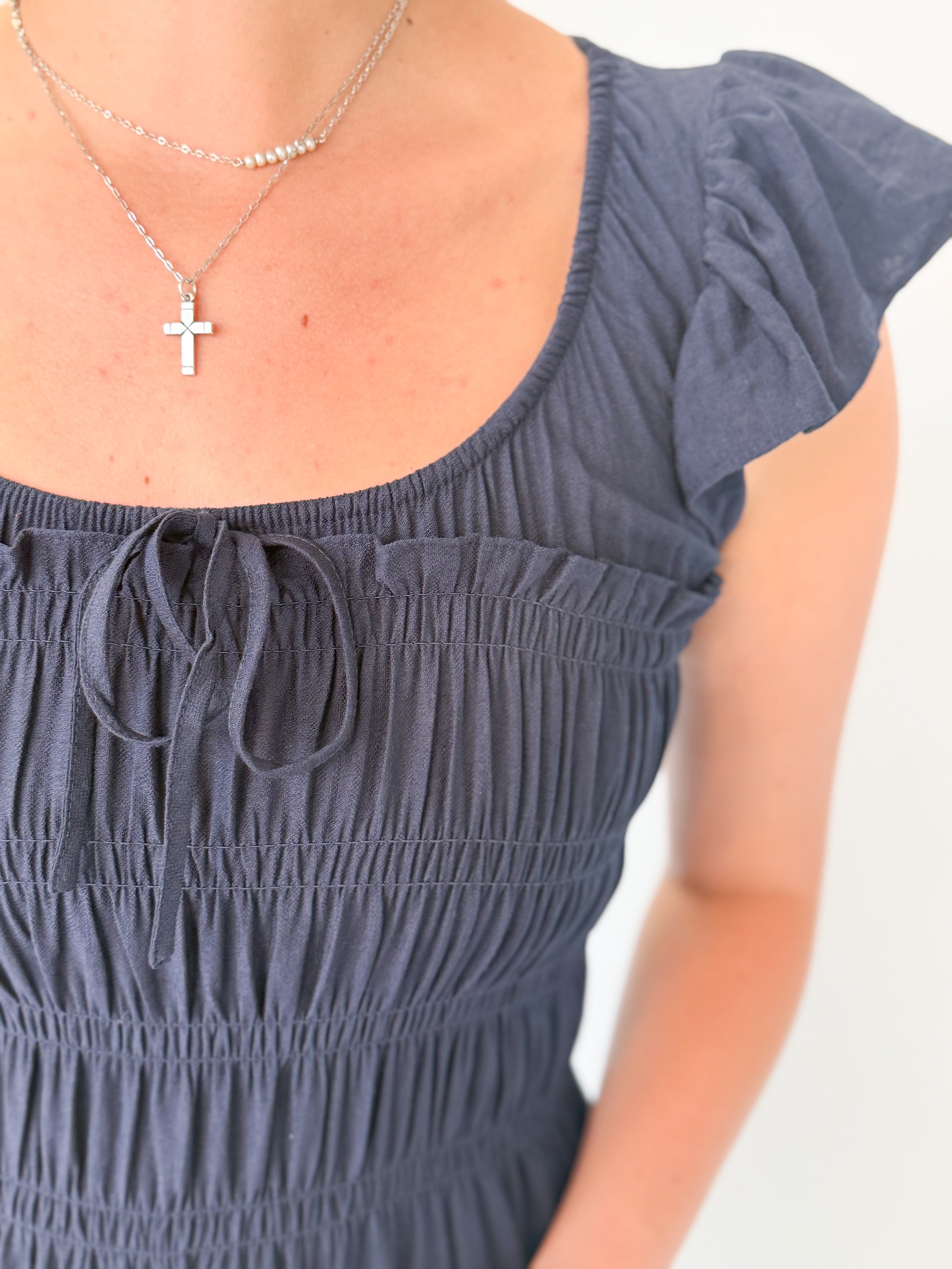 Effortlessly elegant and comfortable, the Rosalie Midi Dress in Navy features a flattering shirred bodice that accentuates your figure. Perfect for any occasion, this dress will have you feeling confident and stylish.
